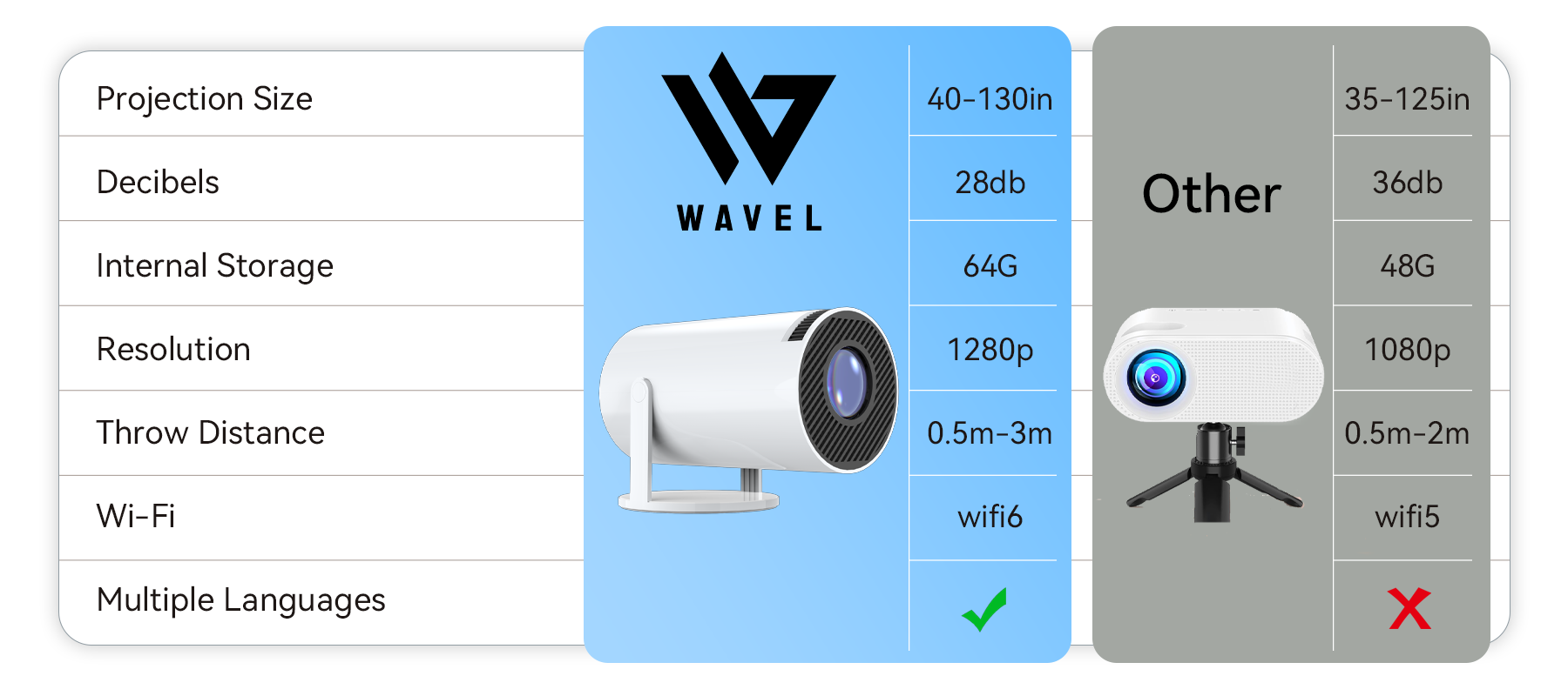 Enter the Wavel Mini Portable Projector: small enough to hold in one hand, yet capable of projecting a massive 130-inch screen. Movie nights are now simple and effortless, leaving you free to enjoy every moment. Wavel’s promise is simple: bring freedom to entertainment and help you create unforgettable memories anytime, anywhere.